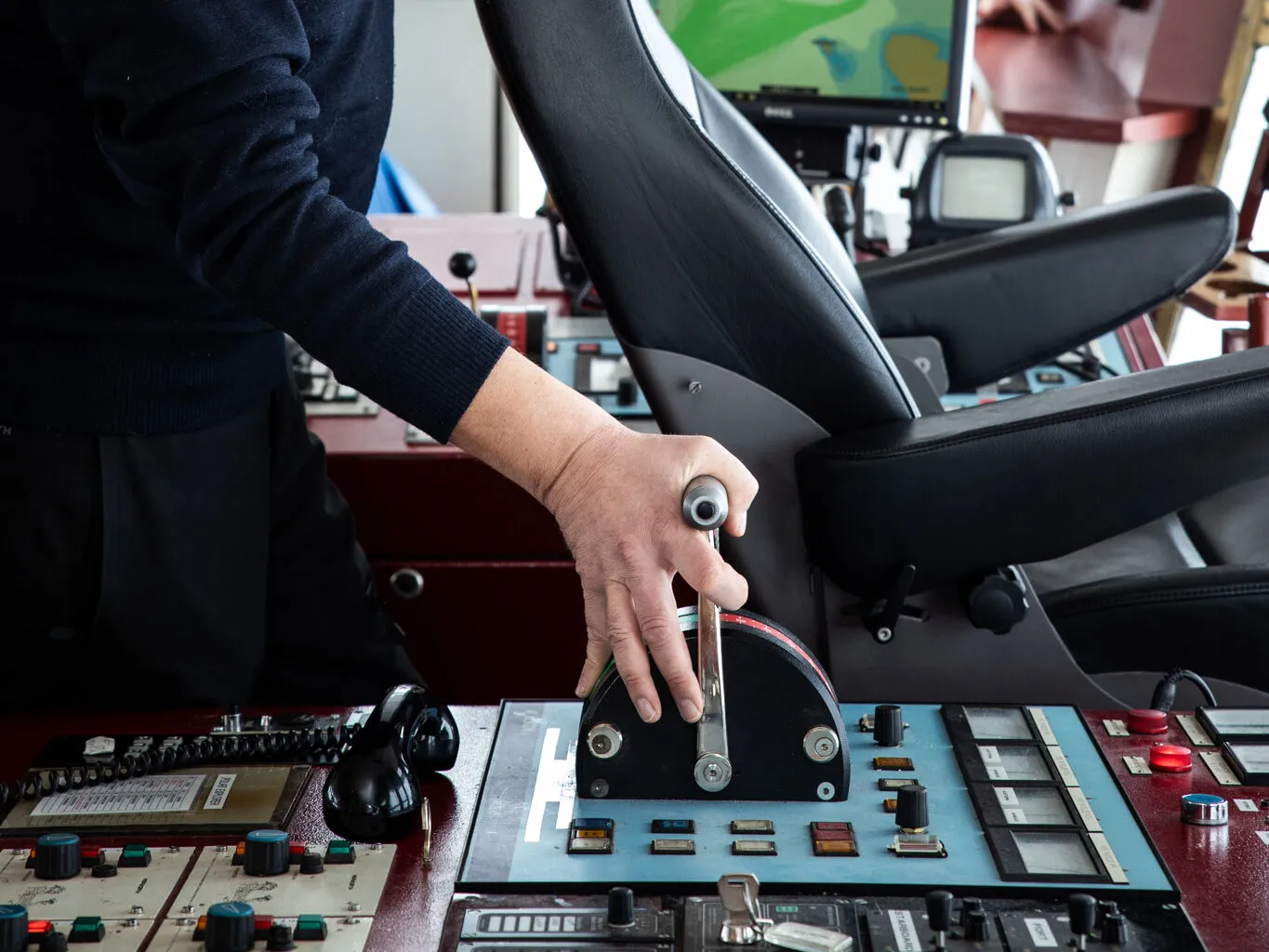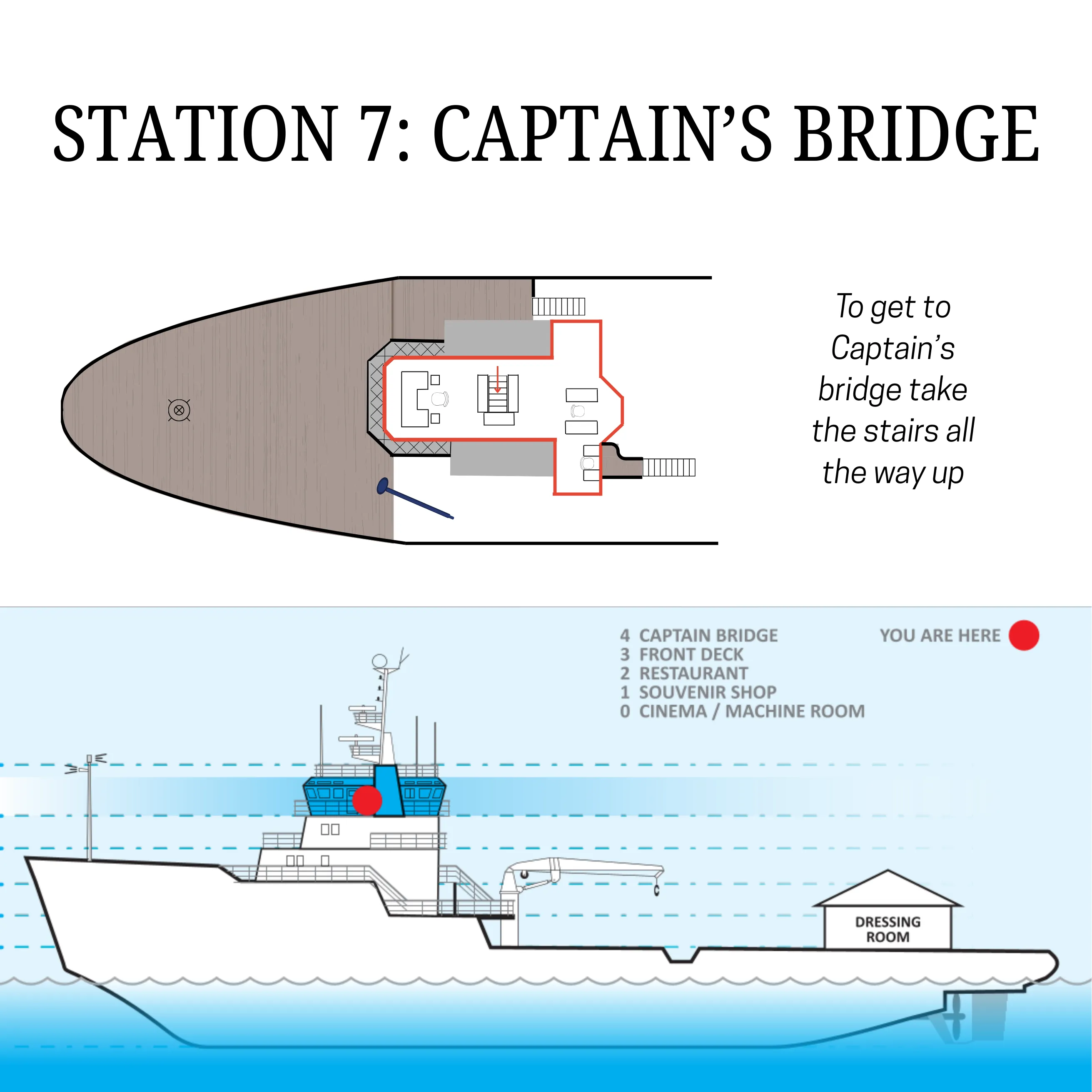 Selamat datang di anjungan kapten. Ini adalah mata dari kapal pemecah es. Sekarang anda berada di ketinggian 14 m dari atas permukaan laut. Jendela panorama memungkinkan anda mengawasi dek depan dan belakang serta laut di sekitarnya.