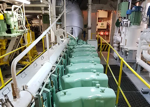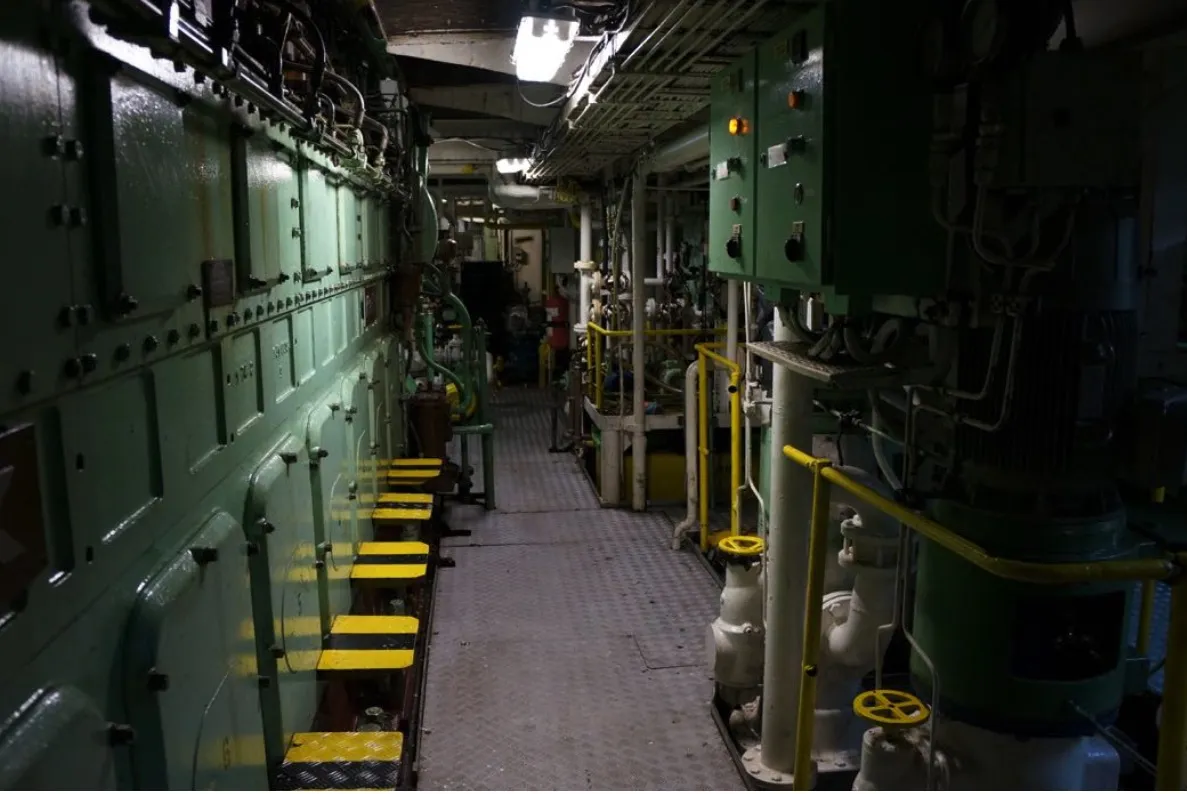Setelah berjalan melewati koridor yang sempit, di sebelah kiri anda, anda akan melihat 8 silinder berwarna hijau – ini adalah salah satu dari dua mesin besar kapal, yang diproduksi oleh perusahaan Jerman bernama Mak. Bagian yang anda lihat adalah bagian atas mesin. Salah satu dari kepala motor pada bagian atas mesin berada dalam keadaan terbuka, memperlihatkan piston yang bergerak dengan cepat. Mesin ini seperti gunung es – anda hanya bisa melihat bagian atasnya. Jika anda melihat ke bawah dari lantai berikutnya, anda dapat melihat keseluruhan badan mesin yang memiliki tinggi sekitar 4 meter, panjang 10 meter dan lebar 2 meter.