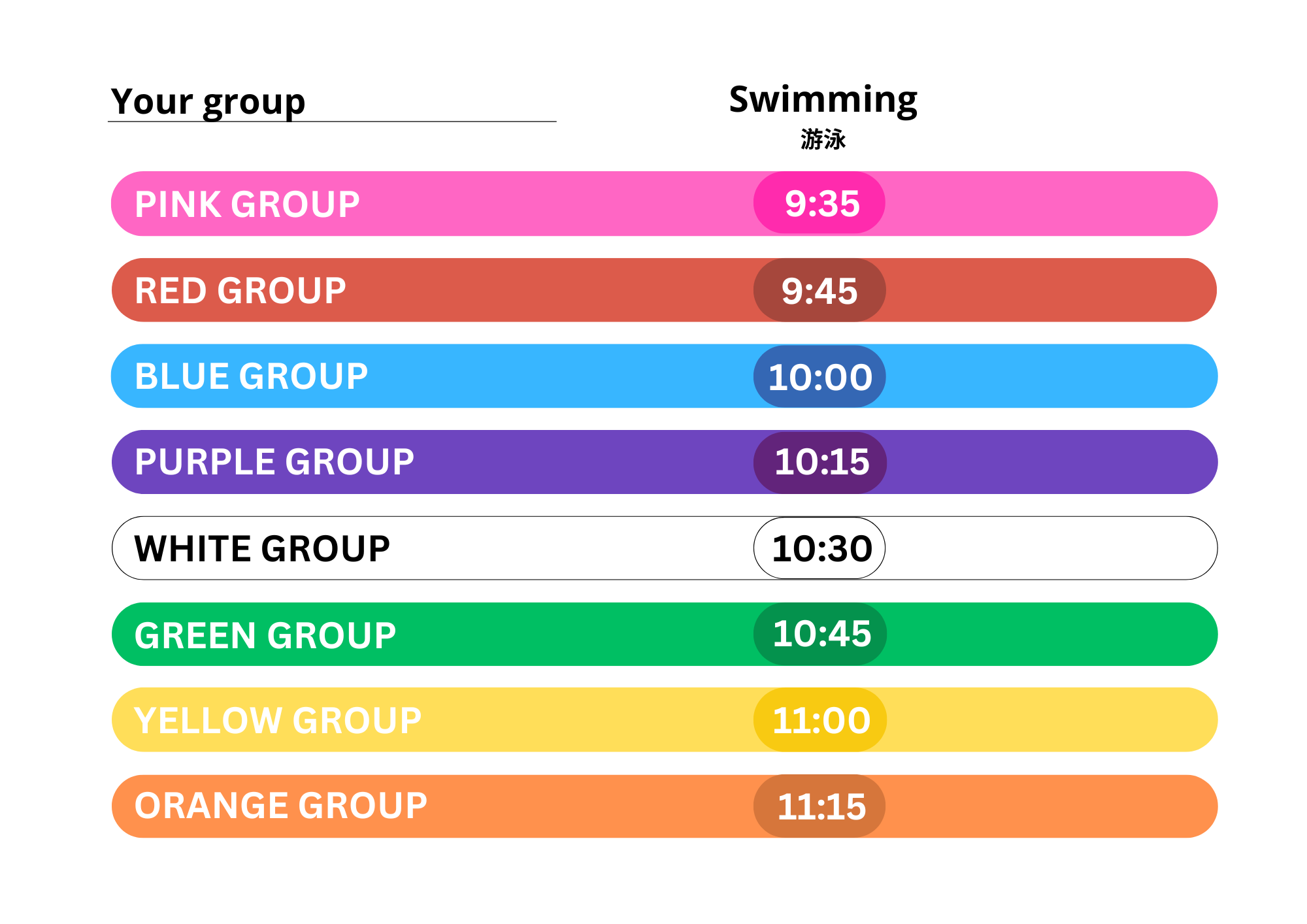 Check your swimming time based on your bracelet color.
