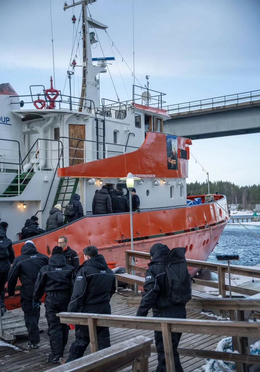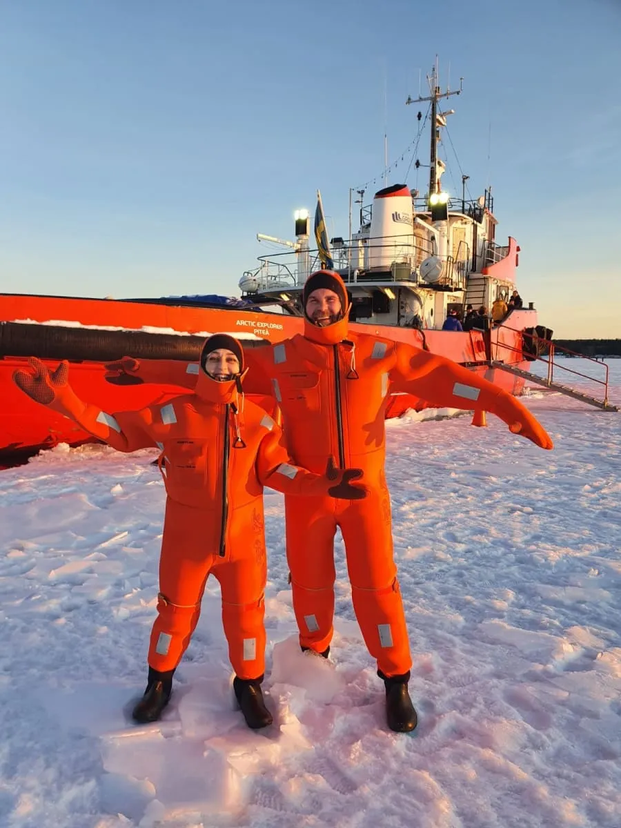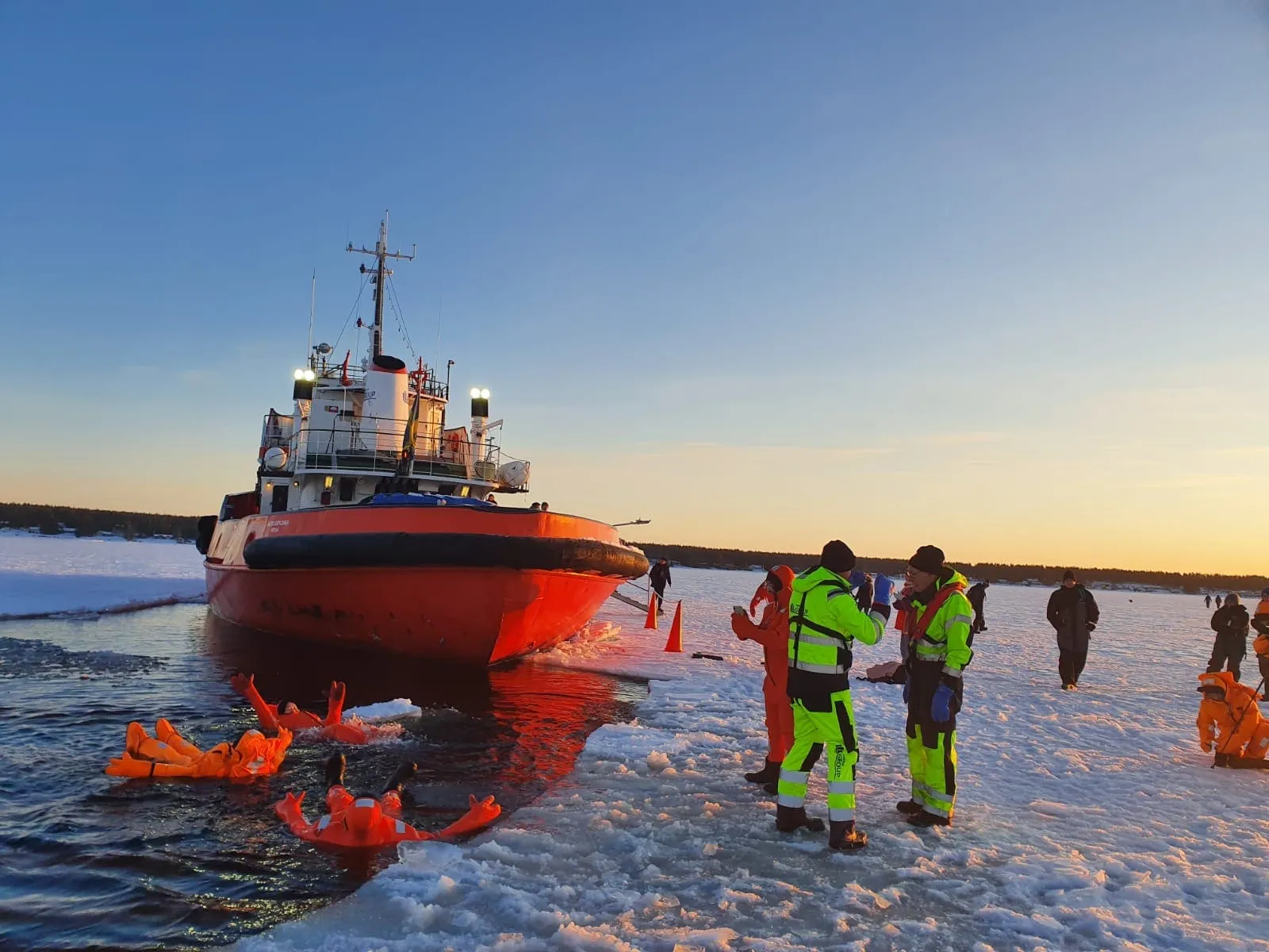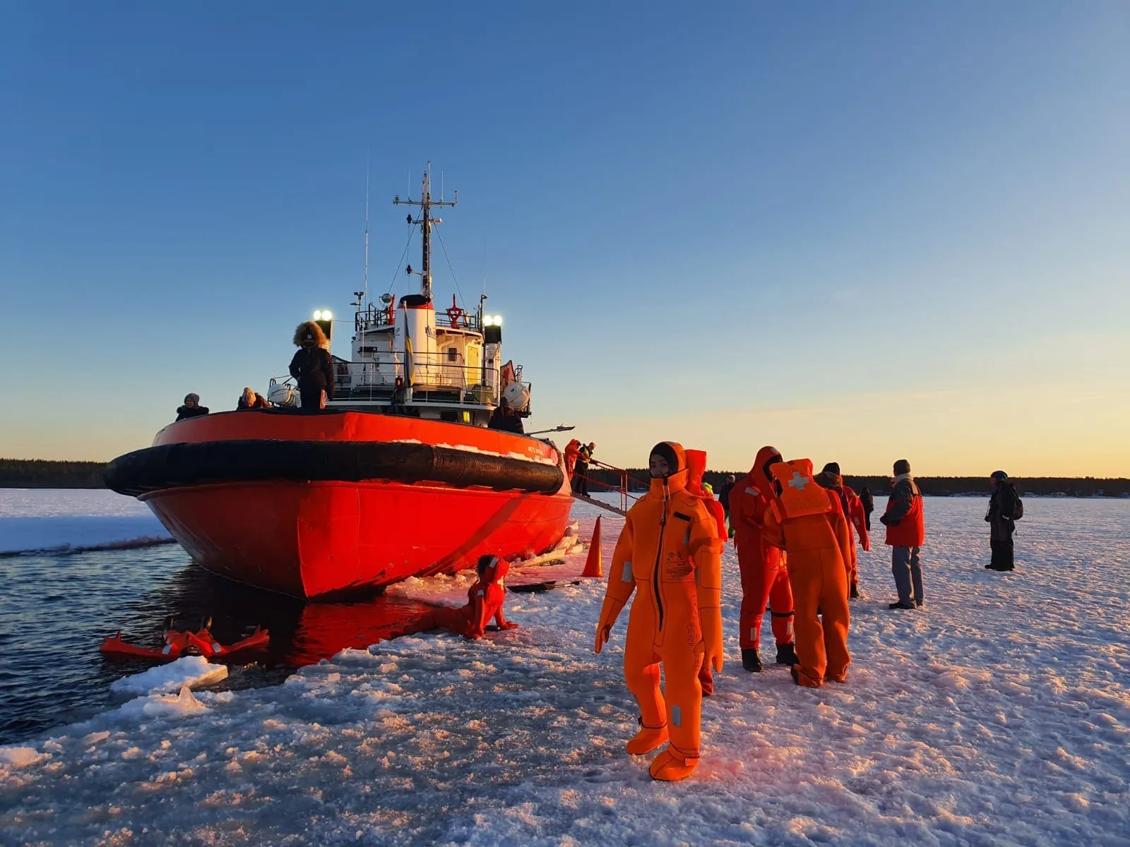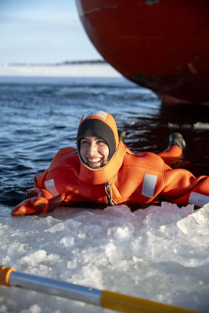Man in orange survival suit lying on ice near open water with a large red icebreaker ship and group of people in the background.