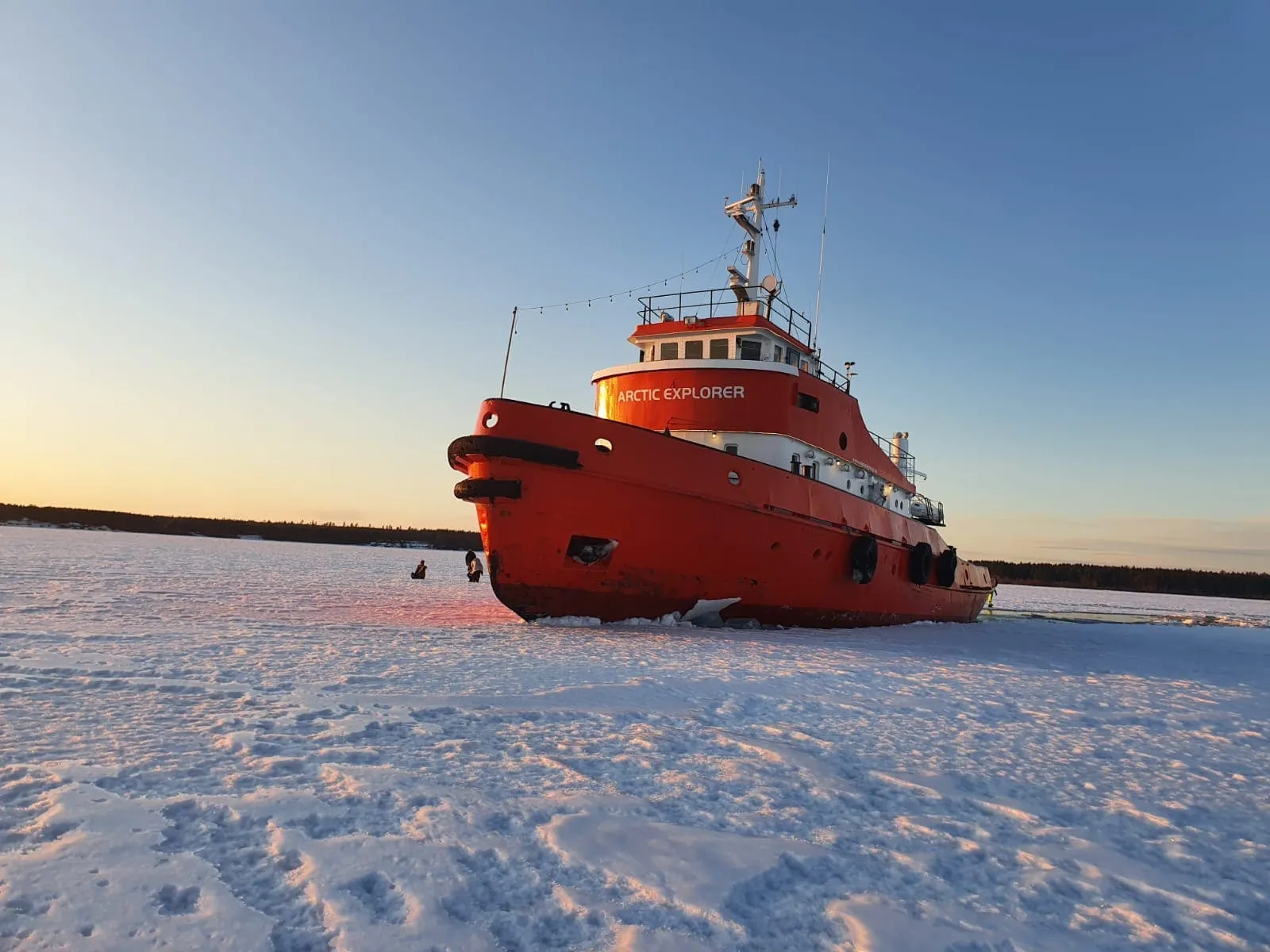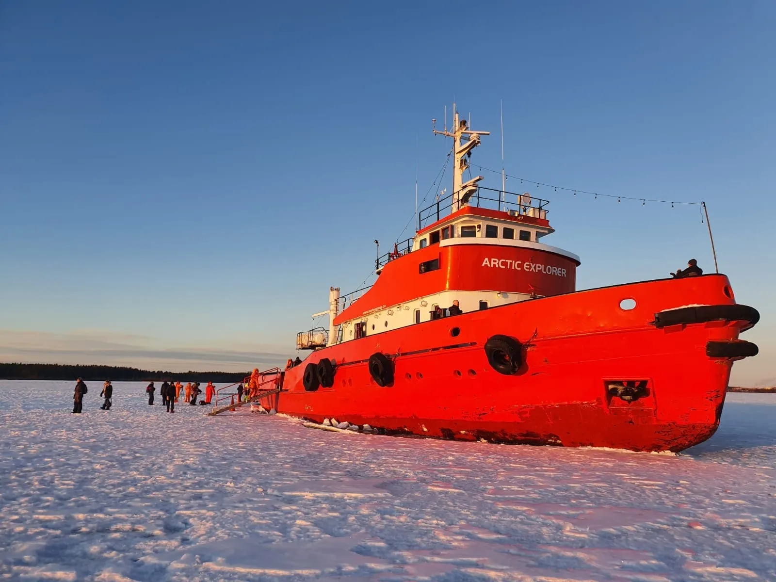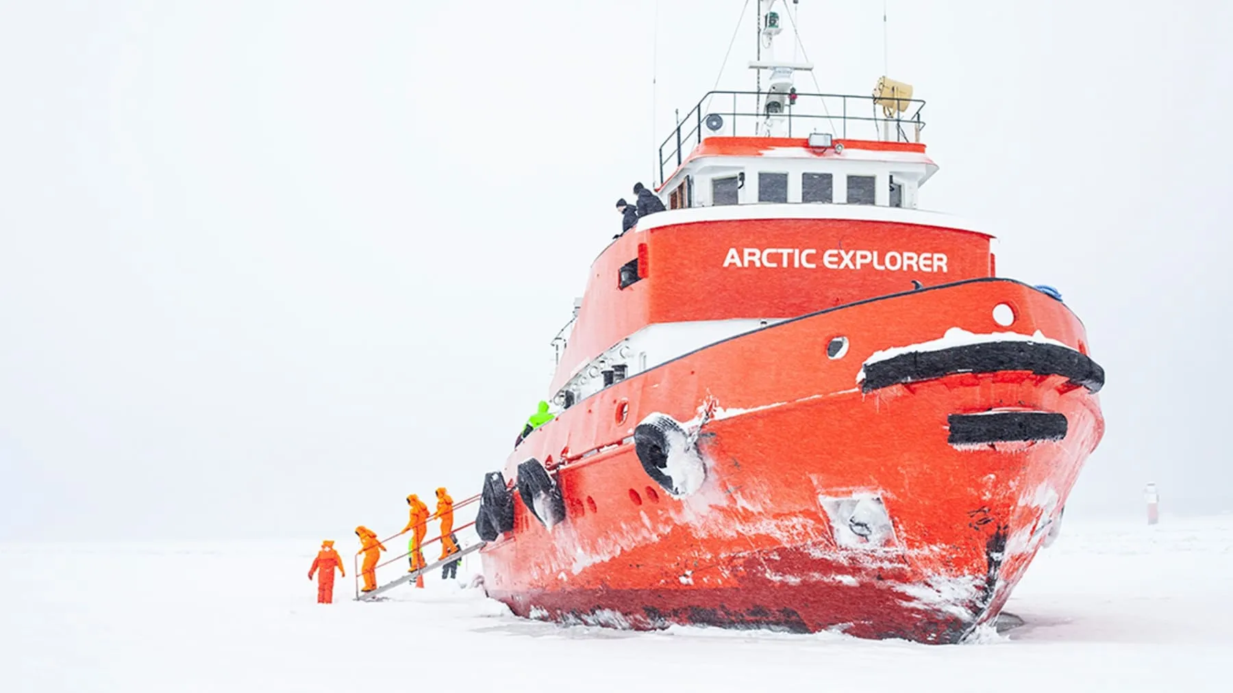 Red and white Arctic Explorer icebreaker ship cutting through frozen icy sea with a clear path behind it during winter.