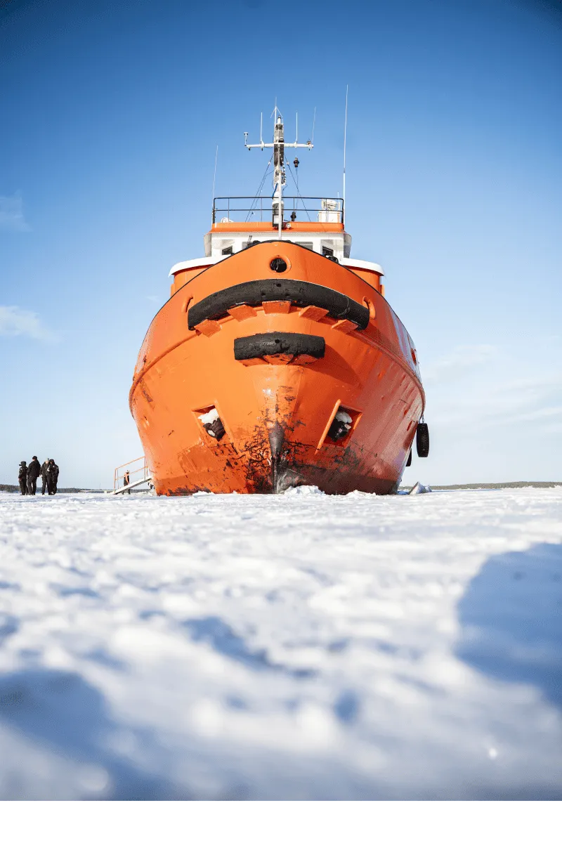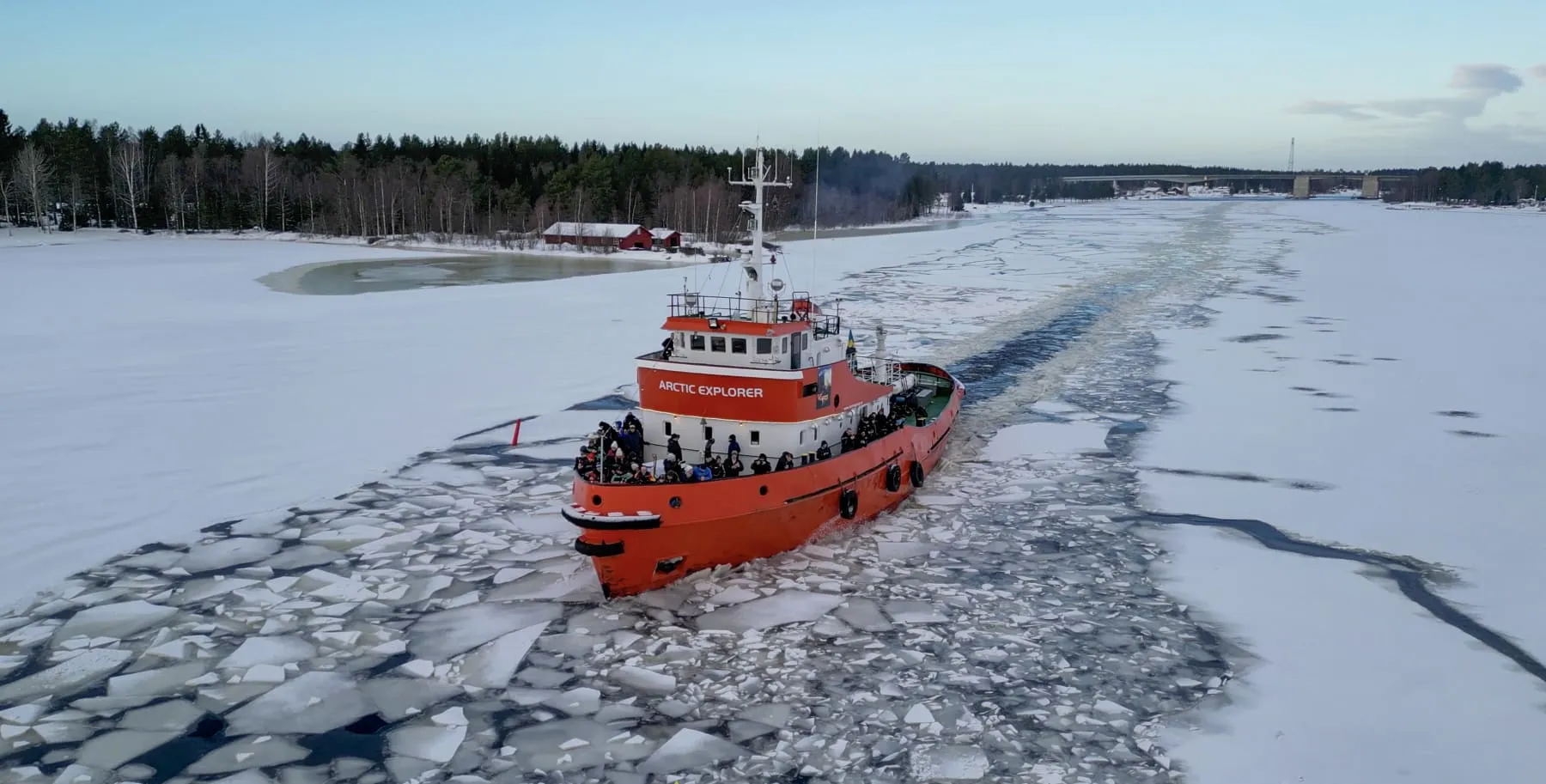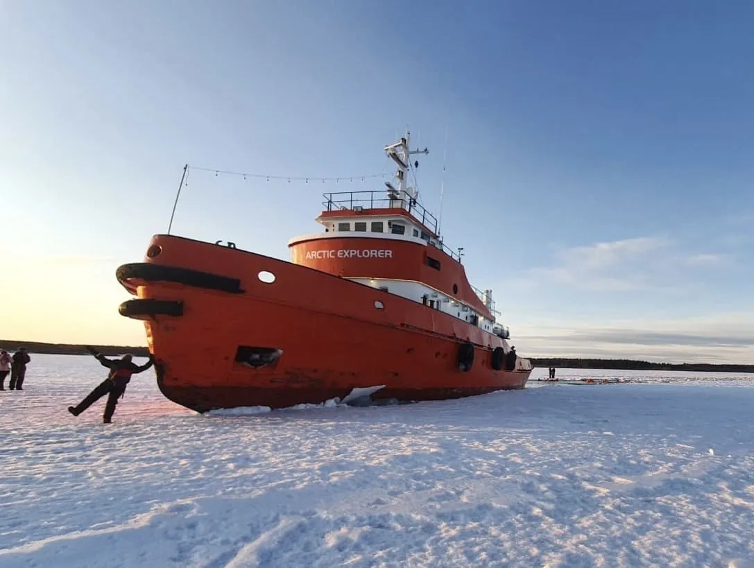 Red and white Arctic Explorer icebreaker ship cutting through frozen icy sea with a clear path behind it during winter.