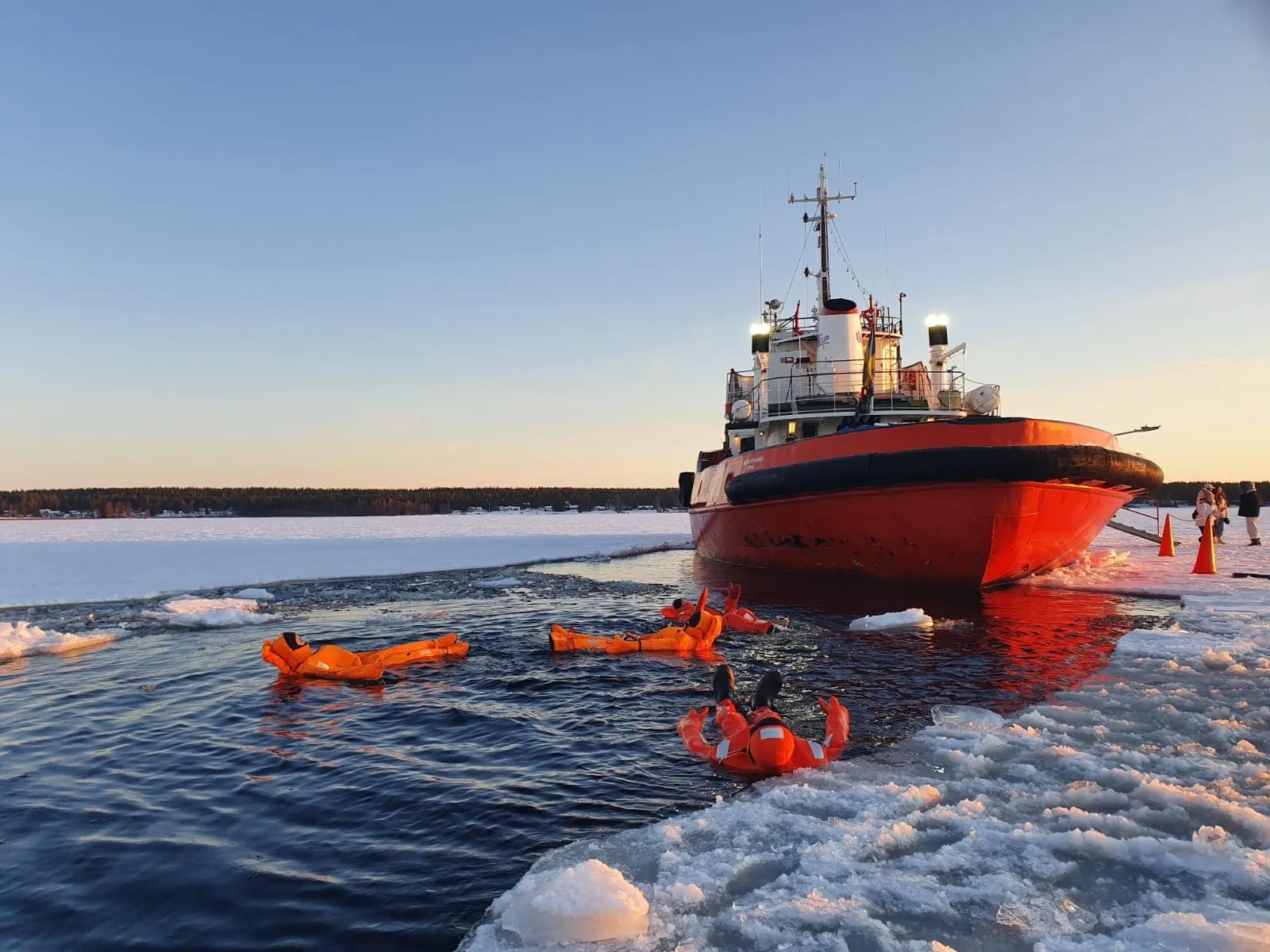Person in an orange survival suit waving while in icy water near floating ice with a rescue boat and three people in cold-weather gear in the background.